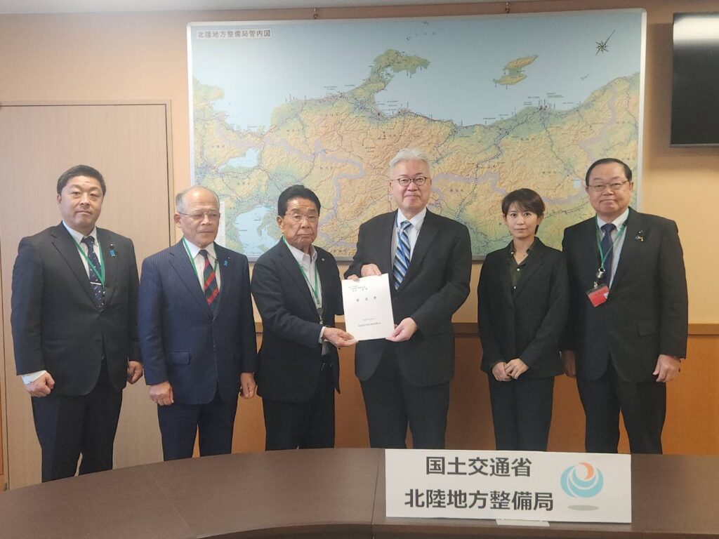 10月24日、自民党県連役員は、国土交通省北陸地方整備局を訪れ、高松局長ほか河川、道路、港湾等関係部長に対し、富山県の重要インフラの整備促進について要望活動を行いました。県東部関連では、国道8号の4車線化促進、朝日防災(城山・横尾トンネルの新規建設)の推進、下新川海岸整備事業促進、黒部川流域の砂防事業促進、国道41号大沢野富山南道路整備事業促進、北アルプス横断道路構想推進等です。私は、特に朝日防災について、発災時の避難道路としてトンネル内の歩道設置の必要性を述べました。高松局長、関係部長から、一つ一つの項目について丁寧な状況説明があり、その真摯な対応はとても有り難いものでした。また、建設業における人手不足が深刻な課題である点についても認識を共有しました。この要望活動は毎年実施しており、その成果が予算に現れている現実があります。国におても地方においても、インフラ整備は成長の礎であり、今後もしっかりとこの要望活動を継続していくことが大事だと思います。