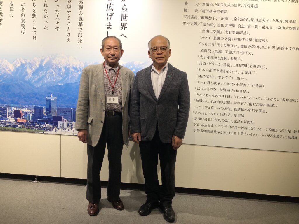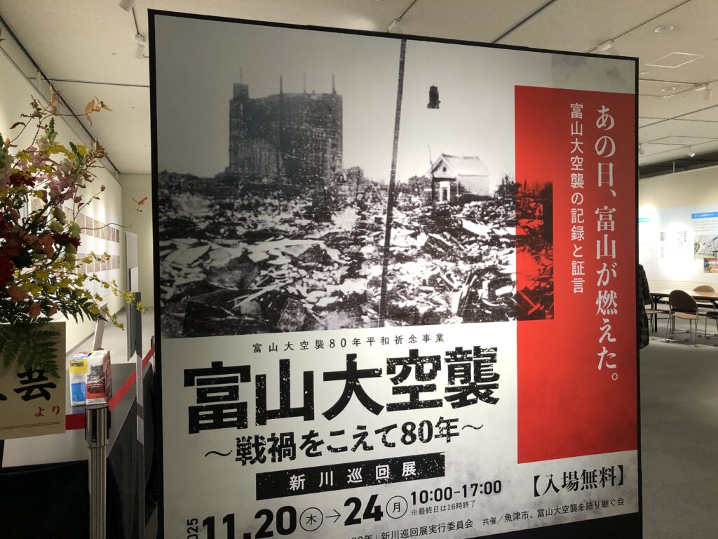 11月21日、新川文化ホールで開催の「富山大空襲〜戦禍をこえて80年〜」を観てきました。昭和20年8月2日の大空襲による惨状について、非常に分かり易く整理された内容で展示されていました。本企画実行委員長の飯田さんや富山大空襲を語り継ぐ会代表幹事の高安さんにお会いし説明もして頂きました。高安さんは、戦災関連資料、遺品等の収納、展示のための恒久施設として資料館の早期設置が必要であることを熱っぽく語られました。新潟県長岡市には立派な戦災資料館があることや長岡空襲史跡めぐりの企画もあることなども話され、富山との歴史を語り継ぐことに対する意識の違いを強く感じました。富山においても、戦後80年の節目に当たり、行動を起こす時でないかと思います。