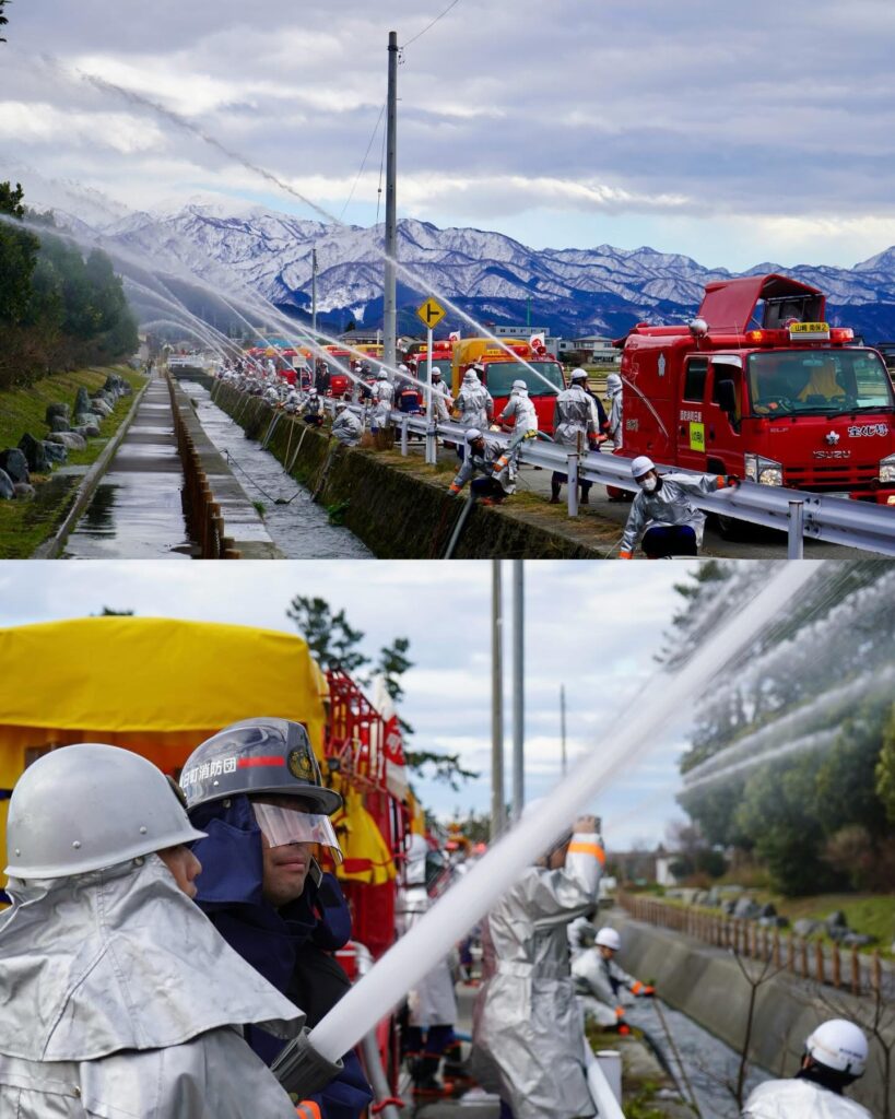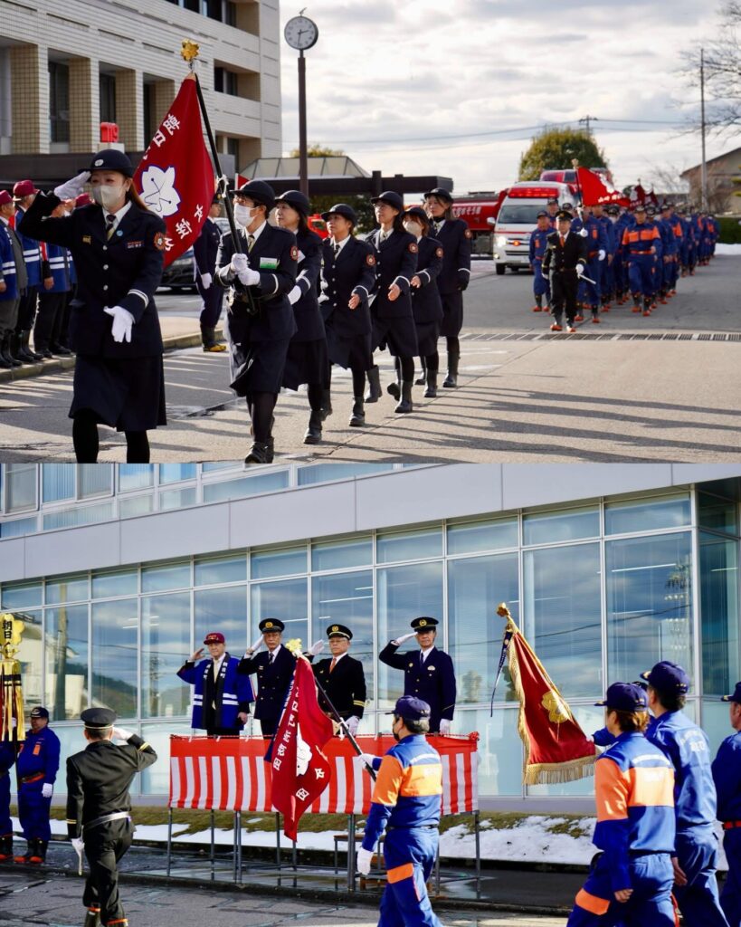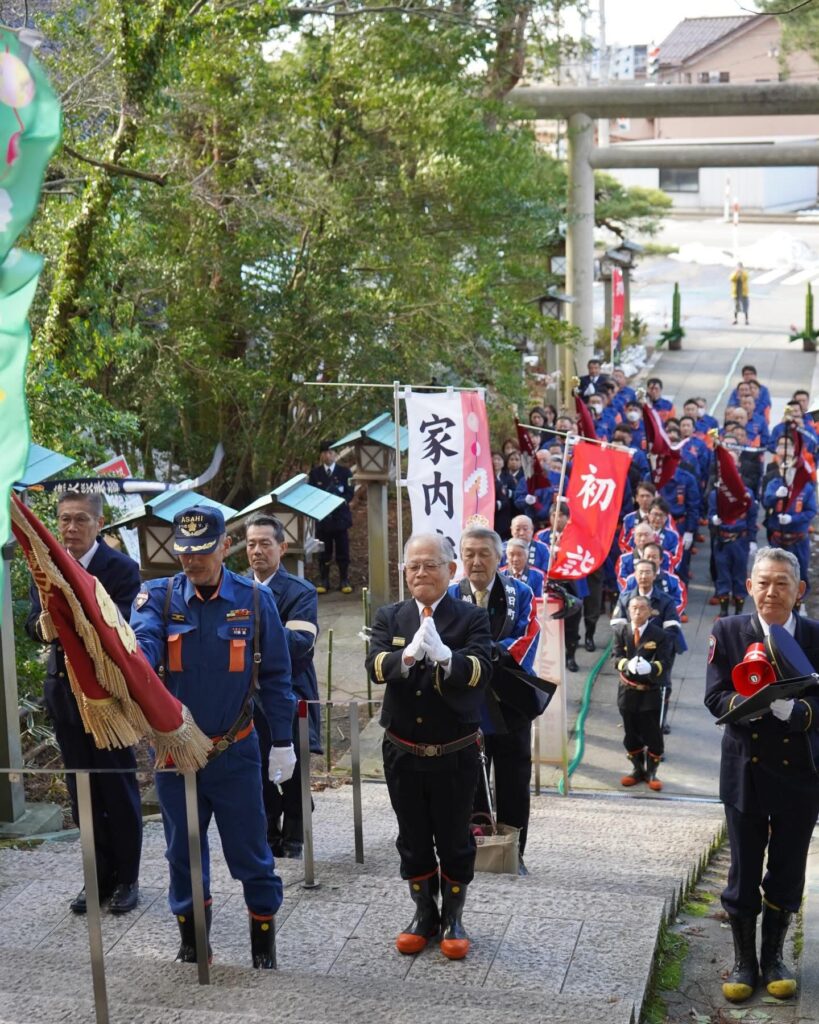 1月10日、朝日町消防出初式が挙行されました。団長として開会の挨拶をしました。その中で、朝日町の昨年1年の無火災を報告し、これは、町民の防火意識の高さを示すものですが、その影にある消防団員の平時の防火の呼びかけ等の地道な活動の賜であると話し、団員一人一人に感謝の気持ちを伝えました。その後、脇子八幡宮で今年の無火災祈願を行い、一斉放水、分列行進と進行しました。分列行進の最後に、県消防防災ヘリが上空に来て隊員が我々を激励してくれました。当方も全員で手を振って応答しました。今年一年、皆で頑張るぞと士気が高まる出初式となりました。